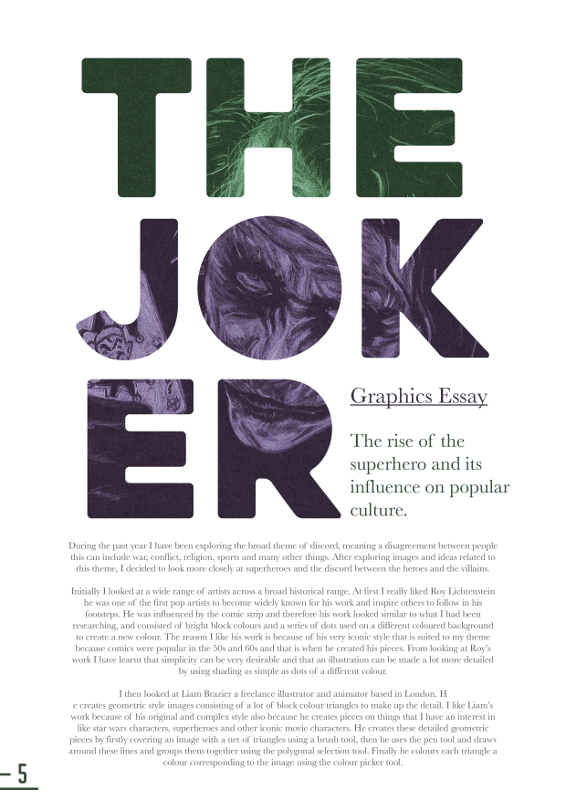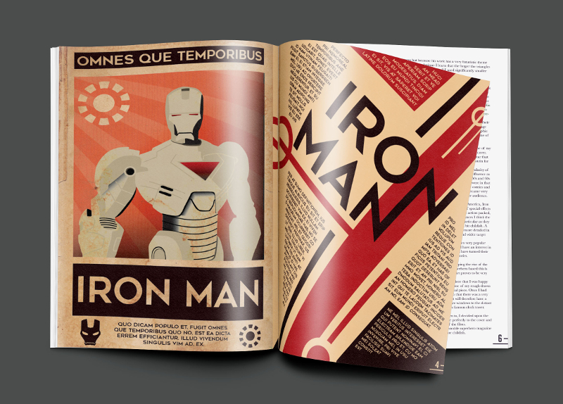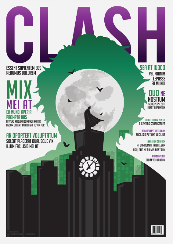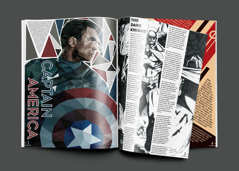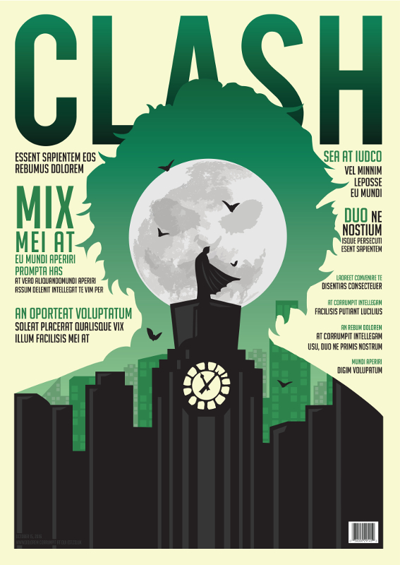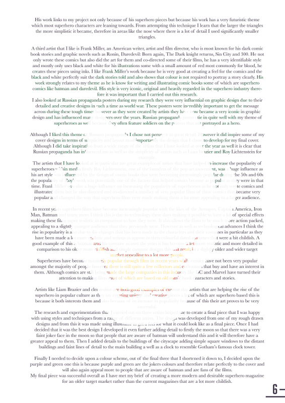 This was the final piece for my second year coursework. I set out to design a cover for a superhero magazine aimed at an older more sophisticated target market. I also designed a few interior pages and some alternative colour schemes.